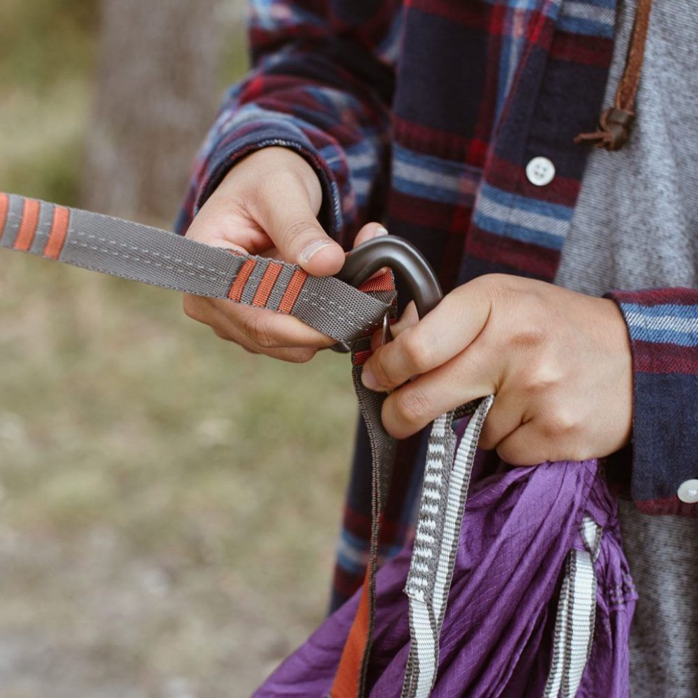 The Kammok Roo Double is suspended from Kanga Claw™ patented carabiners, engineered to support up to 22kN. Double wire gates ensure your hammock won’t slip out while you hang, so you can rest easy all night long. Our Dyneema Racer Slings™ are 15 times stronger than steel, capable of supporting 22kN each as well.